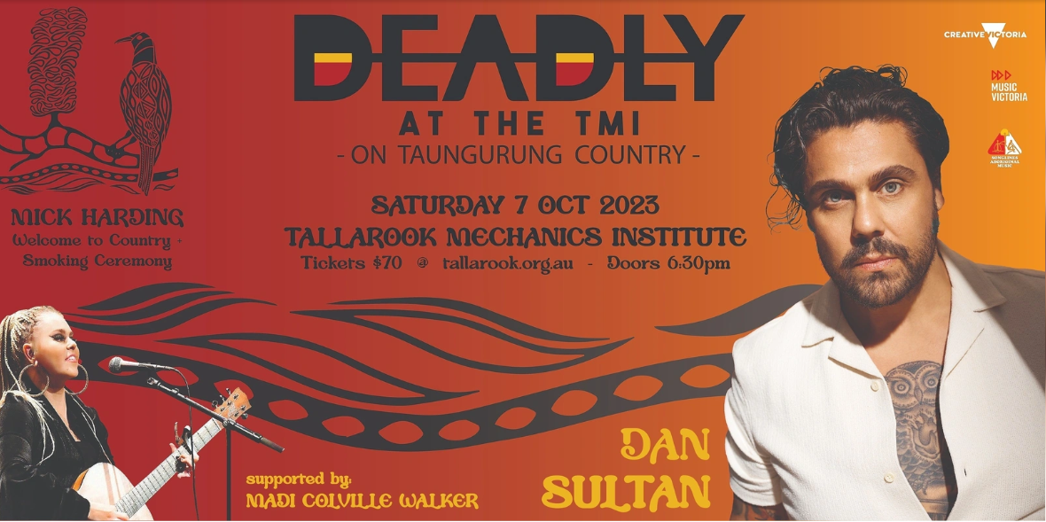 The Tallarook Mechanics Institute is excited to announce an evening of live music from Dan Sultan. Deadly at the TMI is a unique opportunity to share and embrace Aboriginal culture. As the sun sets on Taungurung Country, Mick Harding will open the event with a Welcome to Country and a smoking ceremony. More details below.