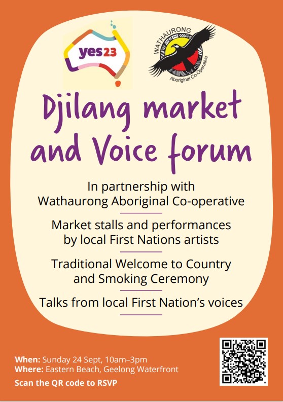 This will be a simple yet powerful opportunity for those across our community to come together in celebration of our local First Nations peoples in the lead up to this historic referendum. Market stalls and performances, also a Wathaurong yarning tent throughout the day where the public are welcome to come with their questions at the Eastern Beach Park.