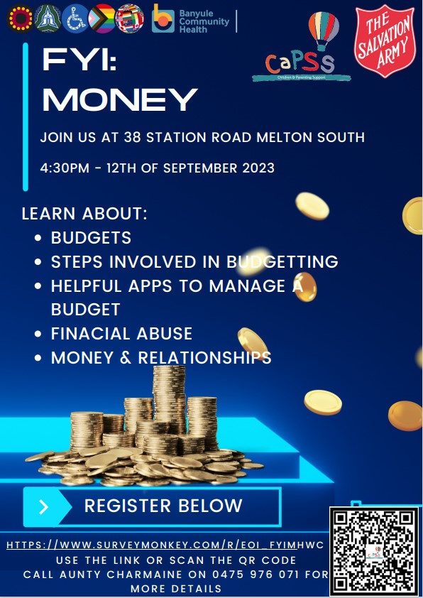 Please join in for the information session to learn about budgets, step involved in budgeting, helpful apps to manage budget, financial abuse, money & relationships @ The Salvation Army Children and Parenting Support Services in Melton South on the 12th September 2023 4:30pm. Click the link below for more details.