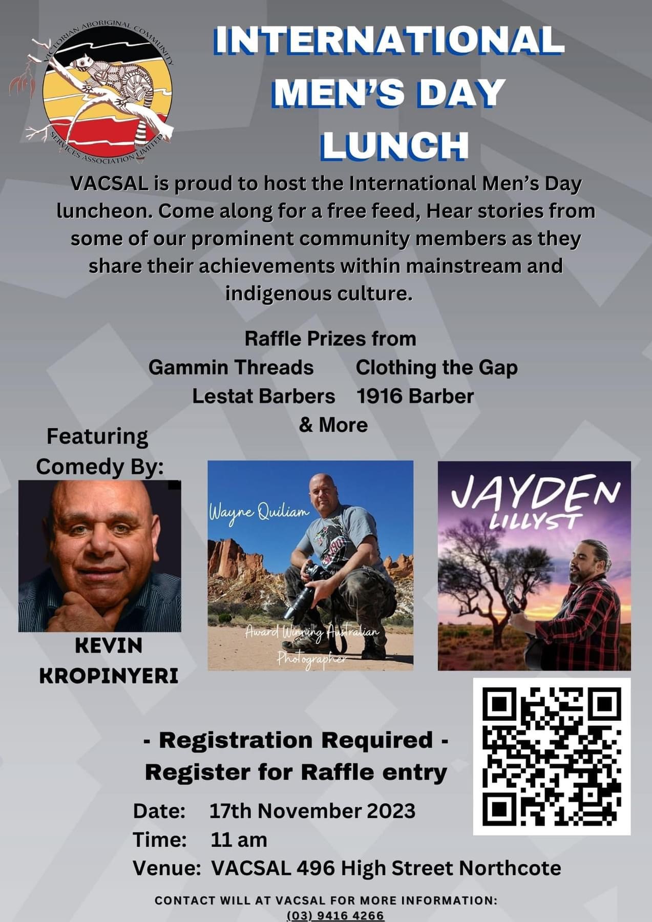 VACSAL is proud to host the International Men’s Day luncheon. Come along for a free feed, hear stories from some of our prominent community members as they share their achievements within mainstream and indigenous culture. Raffle prices from Gammin Treads, Clothing the Gap, Lestat Barbers, 1916 Barber & More. Register for Raffle Entry.
