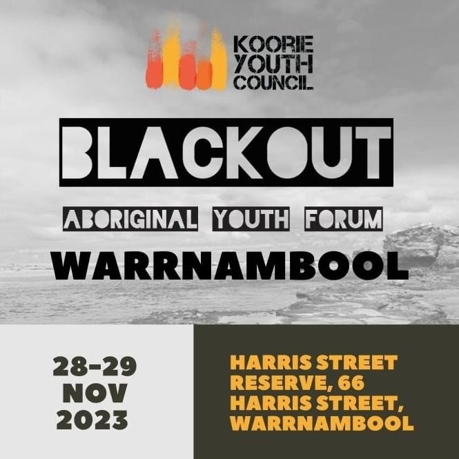 The Koorie Youth Council invite mob from the Southwest region, youth ages 16-28 years to participate in the Koorie Youth Blackout! A time to come together and speak about their experiences within their community, and to create a safe, brave, and outcome-based space, with the main purpose for this space creating a chance for healing, listening and sharing.