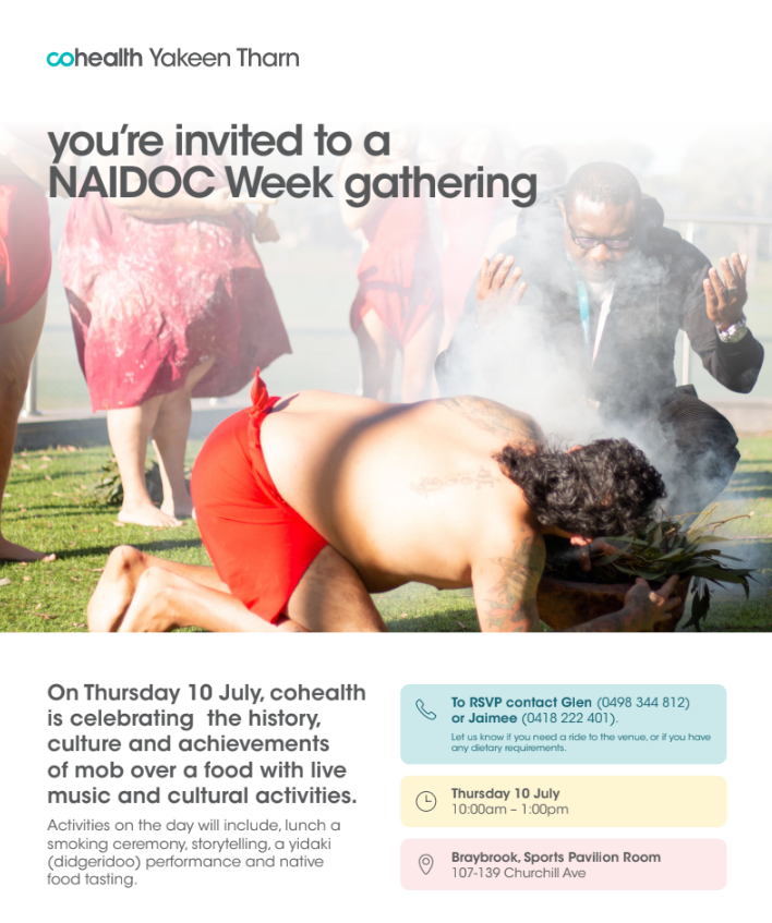 cohealth invite you to celebrate the history, culture and achievements of mob. Includes smoking ceremony, lunch, yiddaki performance and native food tasting.