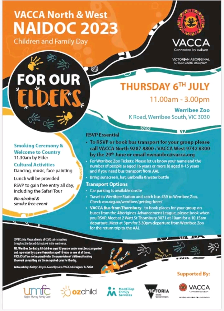 VACCA invites our families in the West to join us in celebrating NAIDOC with a deadly day of fun with free lunch & cultural activities! RSVP for free entry to Werribee Zoo, including a Safari Tour. Contact VACCA West at 9742 8300 or email nwnaidoc@vacca.org